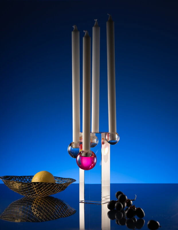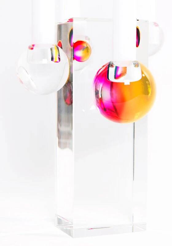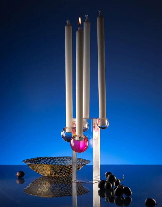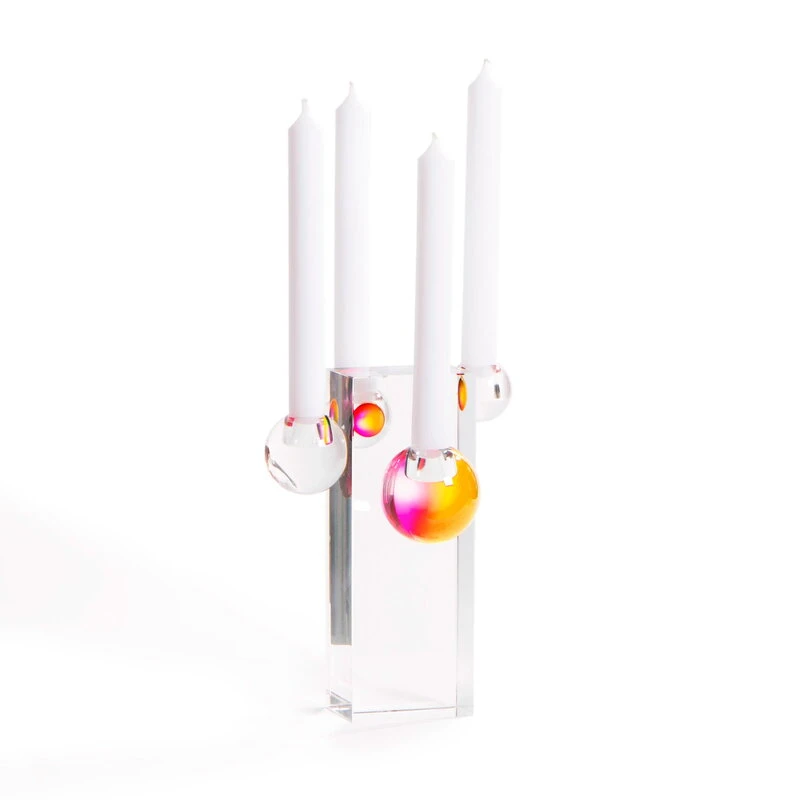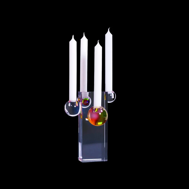 Der Drops-Kandelaber von Fundamental Berlin bietet einen skulpturalen Rahmen für vier Kronenkerzen. Der schöne Kerzenständer ist aus Kristallglas gefertigt und sein faszinierender, asymmetrischer Look zieht in jedem Raum die Blicke auf sich. Drops besteht aus vier Kristallkugeln, die als Kerzenhalter dienen und an einem transparenten Kristallblock befestigt sind. Die Kugeln scheinen in der Luft zu schweben und der Schwerkraft zu trotzen. Das massive Kristallglas reflektiert und spiegelt Licht und Farben. Der charmante Leuchter kann daher je nach Platzierung eine andere Wirkung entfalten.