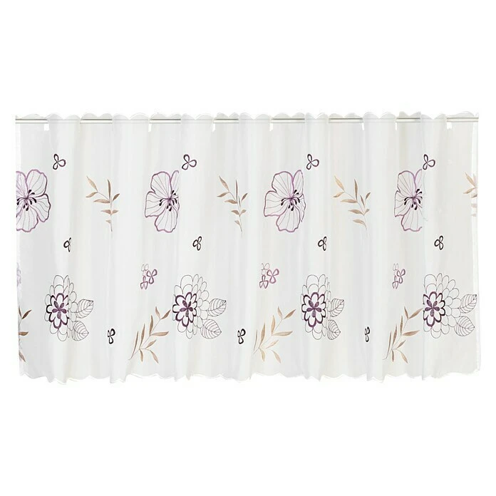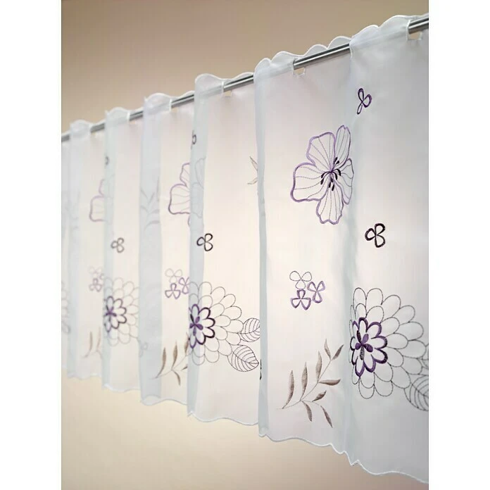 Die Bistrogardine Javine ist ein hochwertig bestickter Voile mit gestickten Ösen und romantischem Blumenmotiv. Ein optischer Genuss, der besonders gut ans Küchenfenster passt. Diese schöne Scheibengardine bietet einen floral-transparenten Sichtschutz, der eine gemütliche Wohnungseinrichtung unterstreicht und den Blick nach Draußen ermöglicht.