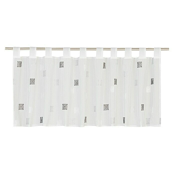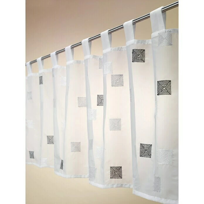 Die Bistrogardine Quadro ist eine transparente Scheibengardine. Der Stoff mit moderner Stickmusterung überzeugt durch den luftigen Fall und die weiche Qualität. Das moderne, aufgestickte Kästchen-Motiv ist ein optischer Genuss, der sich wunderbar auch für kleine Fenster eignet. Die Bistrogardine, oder auch Cafehausgardine genannt, bietet mit Schlaufenaufhängung – zur Montage mit einem Scheibenspanner – einen leichten Sichtschutz: Der untere Teil des Fensters wird dekoriert und der Blick nach Draußen bleibt bestehen.