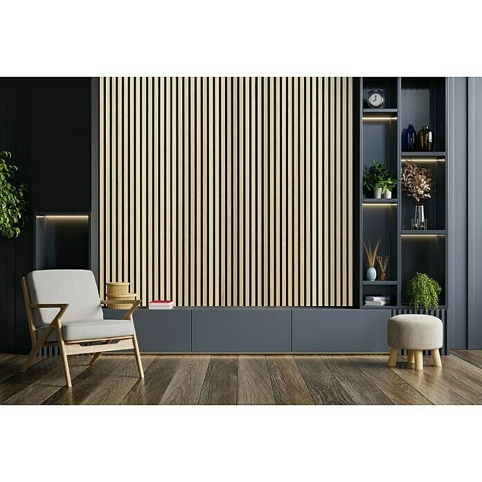 Die FibroTech Akustikpaneele eröffnen völlig neue Gestaltungsmöglichkeiten für Decken und Wände. Zur Ruhe kommen und Schallgeräusche in den eigenen vier Wänden reduzieren. Die schallabsorbierende FibroTech Akustikpaneele wandelt Schallenergie in thermische Energie um, absorbiert diese und streut den reflektierten Klang. Das Paneel schwächt besonders hohe und mittlere Frequenzen ab und wandelt diese in ein qualitativ hochwertiges und sauberes Klangbild. FibroTech verleiht den Räumen ein natürliches, modernes und doch zeitloses Ambiente. Das Raumklima verbessert sich spürbar. Die Akustikpaneele können als Designelement bereits bei der Raumplanung berücksichtigt oder komplette Wände und Decken damit ausgestattet werden (nicht für Feuchträume geeignet). Auch für den Ladenbau, Büros, Produktionsstätten, Aufnahmestudios, Heimkinos, Musikräume, Hörsäle, Proberäume und Konferenzräume sind die Produkte von FibroTech bestens geeignet. Die Montage ist sehr leicht – es werden keine besonderen Vorkenntnisse benötigt, um ein perfektes Ergebnis zu erzielen. Das Trägermaterial besteht aus recyceltem Kunststoff, die Designstreifen aus Hölzern (MDF und edle Echtholzfurniere), welche aus nachhaltiger Forstwirtschaft stammen. Das Produkt ist mit dem FSC® Zertifikat ausgezeichnet. Hinweis: Echtholzfurniere können je Charge voneinander farblich abweichen. Je nach Lichteinfall können die Paneele unterschiedlich die Farbgebung verändern, dies ist naturgegeben und kein Reklamationsgrund. Das MDF-Trägermaterial kann Farbabweichungen aufweisen.