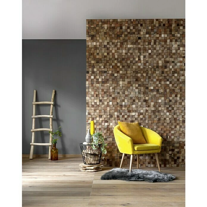 Die Holzpaneele sind aus wiederaufbereitetem Teakholz gefertigt. Egal ob nur eine kleine Fläche oder ganze Wände mit den Holzverblendern verkleidet werden – individuellen Gestaltungsideen sind keine Grenzen gesetzt. Die natürliche rustikale Farbgebung sowie der 3D-Effekt sorgen für eine ausdruckstarke Wandverkleidung im Wohnbereich.