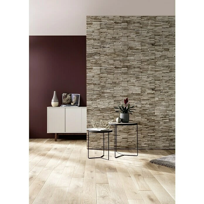 Die Holzpaneele sind aus wiederaufbereitetem Teakholz gefertigt. Egal ob nur eine kleine Fläche oder ganze Wände mit den Holzverblendern verkleidet werden – individuellen Gestaltungsideen sind keine Grenzen gesetzt. Die natürliche rustikale Farbgebung sowie der 3D-Effekt sorgen für eine ausdruckstarke Wandverkleidung im Wohnbereich.