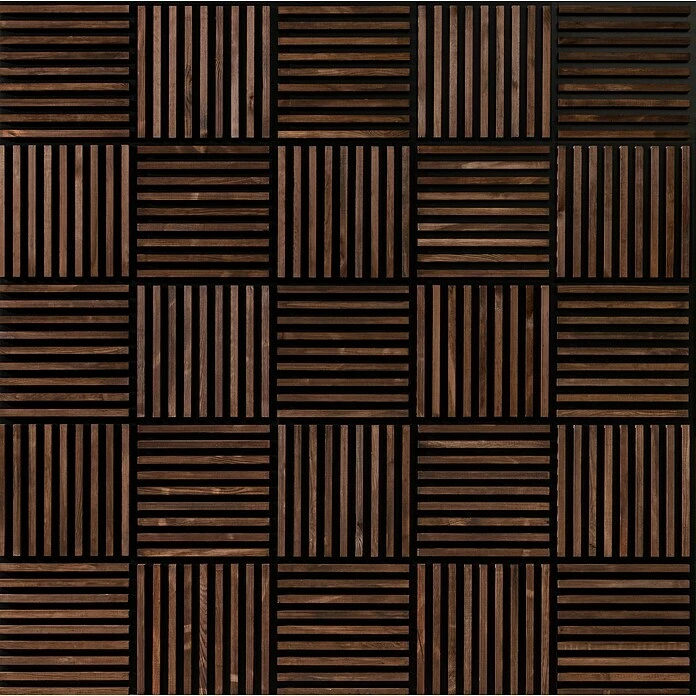 Die Holzpaneele Linea Raw setzen mit ihrer Struktur aus schachbrettartig zusammengesetzten quadratischen Holzelementen mit aufgesetzten parallelen Leisten vor dunklem Untergrund besonders ausdruckstarke 3-D Akzente. Sie stehen für modernes Design, wobei sie durch das Material Holz zugleich Gemütlichkeit und Wärme ausstrahlen. Die Installation der Paneele mittels Montagekleber ist außerordentlich einfach. Die modulare Form der gebrauchsfertigen Elemente ermöglicht nahezu unbegrenzte Möglichkeiten für den Innenausbau. Linea Raw Holzpaneele eignen sich gut zur Verkleidung in strapazierten Wandbereichen wie Treppenhaus oder Lobby. Sie verbergen perfekt Unvollkommenheiten und unebene Oberflächen. Das natürliche Holz der Paneele füllt den Innenraum mit dem natürlichen Duft von Holz und sorgt für ein behagliches Raumklima. Sie lassen sich enorm vielseitig und individuell einsetzen – nicht nur als Wandschmuck, sondern auch beispielsweise als Oberfläche für Schiebe- oder Dekotüren sowie als Elemente im Möbelbau.