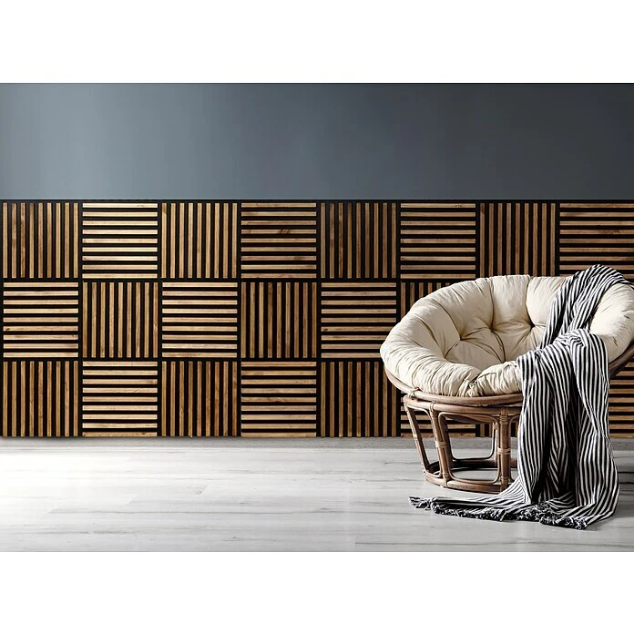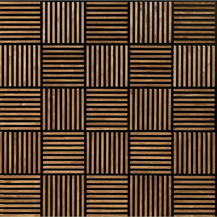 Die Holzpaneele Linea Raw setzen mit ihrer Struktur aus schachbrettartig zusammengesetzten quadratischen Holzelementen mit aufgesetzten parallelen Leisten vor dunklem Untergrund besonders ausdruckstarke 3-D Akzente. Sie stehen für modernes Design, wobei sie durch das Material Holz zugleich Gemütlichkeit und Wärme ausstrahlen. Die Installation der Paneele mittels Montagekleber ist außerordentlich einfach. Die modulare Form der gebrauchsfertigen Elemente ermöglicht nahezu unbegrenzte Möglichkeiten für den Innenausbau. Linea Raw Holzpaneele eignen sich gut zur Verkleidung in strapazierten Wandbereichen wie Treppenhaus oder Lobby. Sie verbergen perfekt Unvollkommenheiten und unebene Oberflächen. Das natürliche Holz der Paneele füllt den Innenraum mit dem natürlichen Duft von Holz und sorgt für ein behagliches Raumklima. Sie lassen sich enorm vielseitig und individuell einsetzen – nicht nur als Wandschmuck, sondern auch beispielsweise als Oberfläche für Schiebe- oder Dekotüren sowie als Elemente im Möbelbau.