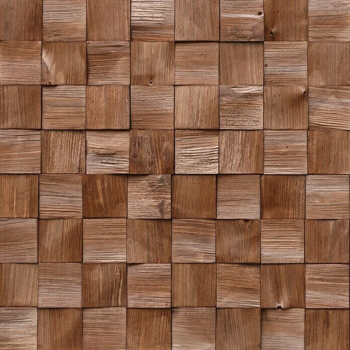 Die Holzpaneele Quadro aus gespaltenem Holz sind eine gelungene Kombination aus grafischem Design und natürlicher Ausstrahlung von echtem Holz. Das Spiel mit der Maserung unterstreicht die lebendige Wirkung dieser Wandverkleidung. Die imprägnierten Elemente im quadratischen Format 38 x 38 cm lassen sich leicht mit handelsüblichem Montagekleber anbringen.