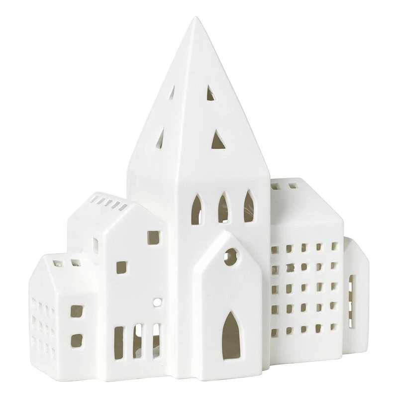 Die City-Laterne aus der Urbania-Serie von Kähler zeigt eine Reihe von städtischen Gebäuden mit einem hohen Kirchturm in der Mitte. Die Oberfläche der Laterne aus Keramik ist wunderschön weiß glasiert.