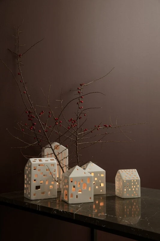 Kählers Urbania-Laternen bieten eine moderne Alternative zu traditionelleren Laternen. Die Keramiklaternen wurden von Mette Bache und Barbara Bendix Becker entworfen und stellen verschiedene Gebäude dar, durch deren unterschiedlich geformte Fenster Kerzenlicht strahlt, das faszinierende Muster auf ihre Umgebung wirft.