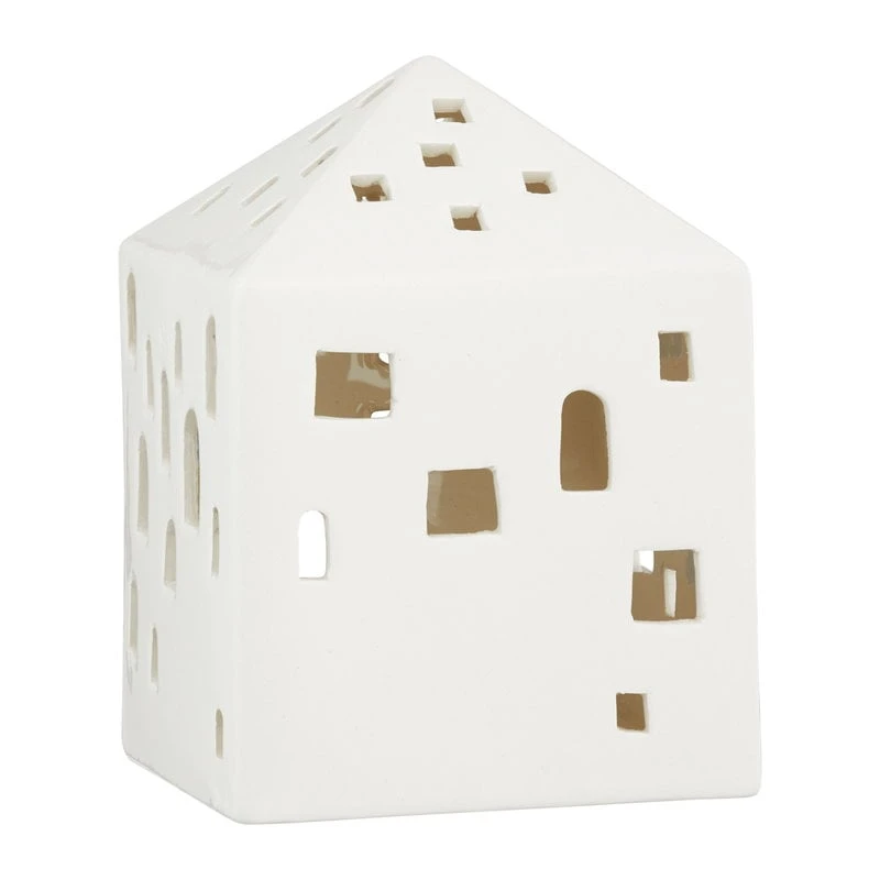 Die Laterne Town House aus der Urbania-Serie von Kähler ähnelt einem Wohnhaus, dessen asymmetrische Fenster und Oberlichter der Laterne ein interessantes, unverwechselbares Aussehen verleihen. Die Oberfläche der Laterne ist wunderschön weiß verglast.