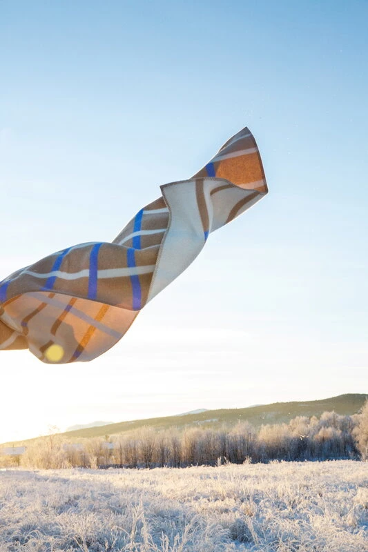 Der Knut-Überwurf von Røros Tweed, der von Hallgeir Homstvedt entworfen wurde, ist ein Genuss für alle Sinne. Das markante Muster der Wolldecke, das an eine optische Täuschung erinnert, wurde in Anlehnung an den Webprozess entworfen: Das Gittermuster steht für die vertikalen und horizontalen Garne oder Fäden des Gewebes. Um unsere visuelle Wahrnehmung weiter herauszufordern, hat sich Homstvedt für auffällige Farbkombinationen entschieden.