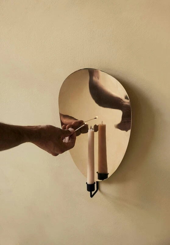 Der von Krøyer-Sætter-Lassen entworfene Wandleuchter besteht aus einem schwarz lackierten Stahlsockel und einer Rückwand aus poliertem Messing, die das Licht der Kerze lenkt, reflektiert und verstärkt – und die auch dann ins Auge fällt, wenn die Kerze gerade nicht brennt. Die unverwechselbare, entzückend abstrakte Rückwand verleiht Flambeau (Französisch für Fackel) ein elegantes und zugleich verspieltes Aussehen und macht ihn zu einer bezaubernden Ergänzung für jedes Interieur.