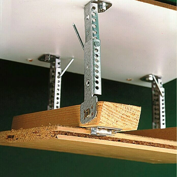 Die Staba Deckenabhänger SB 10 ermöglichen ein millimetergenaues Abhängen in einem Justierbereich von 10 – 20 cm. Die verzinkten Justierhänger können durch Umbiegen der Befestigungsflächen zusätzlich die Abhängelänge kürzen. Die Justierhänger müssen nach oben geschraubt und können zur Seite geschraubt oder genagelt werden. Je nach Spannweite bzw. Tragkraft des Holzes (ca. 60 – 80 cm) wird der Hänger auch beidseitig angesetzt. Nach endgültiger Justierung des Abhängers sichert das Umbiegen des Justiernagels die eingestellte Abhängelänge.