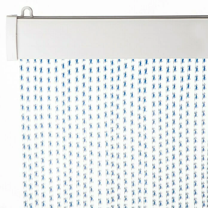 Der Türvorhang Rom aus lichtdurchlässigen transparenten Strängen die nuanciert mit blauen Details durchzogen sind, schafft die Gratwanderung zwischen Eleganz und Funktion. Zudem kann er einfach mittels Haken in der Tür montiert werden.