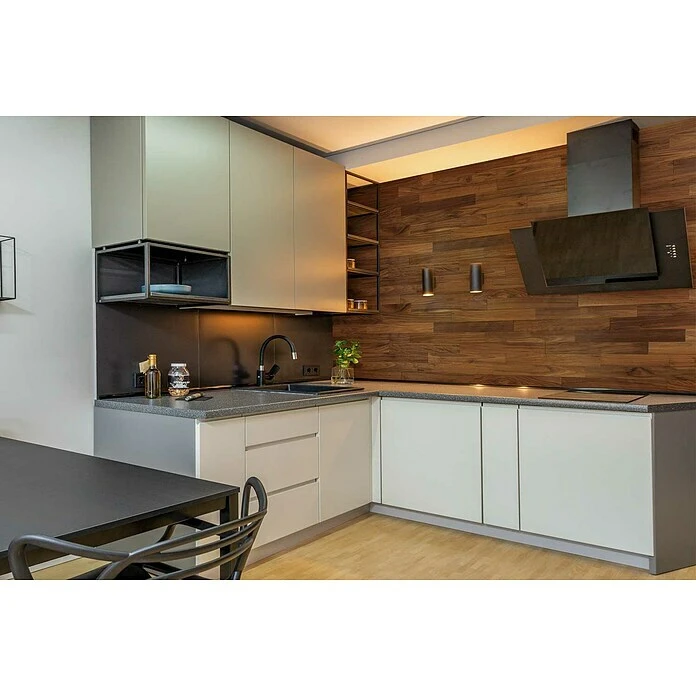 Die Wodewa Echtholzriemchen 1000 aus amerikanischem Nussbaum bieten jede Menge Möglichkeiten für die individuelle Innenraumgestaltung mit Holz. Mit der 3D-Holzdekoration gelingt es schnell und einfach Zimmerwände zu gestalten. Die Anwendung ist sowohl für große Flächen als auch kleine Akzente geeignet. Das Anbringen der Massivholzwandverkleidung ist auf allen tragfähigen, glatten und festen Untergründen möglich. Eine optimale Tiefenimprägnierung durch modernste Fertigungstechnik mit mehrmaligem Auftrag gewährleistet einen zuverlässigen Oberflächenschutz vor Feuchtigkeit und Verschmutzung. Die Wodewa Holzwandverkleidung kann mit einem weichen feuchten Tuch, einem Staubwedel oder durch Absaugen einfach gereinigt werden. Dank der drei verschiedenen Materialstärken entsteht eine außergewöhnliche 3D-Optik. Die freie Verlegung garantiert ein Unikat als Fläche. Natürliche Wuchsmerkmale und Farbabweichungen sind ein Beweis dafür, dass es sich um echtes Holz handelt.