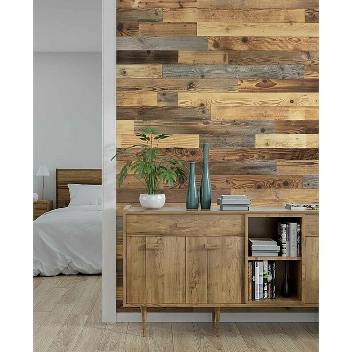 Die Wodewa Echtholzriemchen 1000 aus Kiefer bieten jede Menge Möglichkeiten für die individuelle Innenraumgestaltung mit Holz. Mit der 3D-Holzdekoration gelingt es schnell und einfach Zimmerwände zu gestalten. Die Anwendung ist sowohl für große Flächen als auch kleine Akzente geeignet. Das Anbringen der Massivholzwandverkleidung ist auf allen tragfähigen, glatten und festen Untergründen möglich. Eine optimale Tiefenimprägnierung durch modernste Fertigungstechnik mit mehrmaligem Auftrag gewährleistet einen zuverlässigen Oberflächenschutz vor Feuchtigkeit und Verschmutzung. Die Wodewa Holzwandverkleidung kann mit einem weichen feuchten Tuch, einem Staubwedel oder durch Absaugen einfach gereinigt werden. Dank der drei verschiedenen Materialstärken entsteht eine außergewöhnliche 3D-Optik. Die freie Verlegung garantiert ein Unikat als Fläche. Natürliche Wuchsmerkmale und Farbabweichungen sind ein Beweis dafür, dass es sich um echtes Holz handelt.