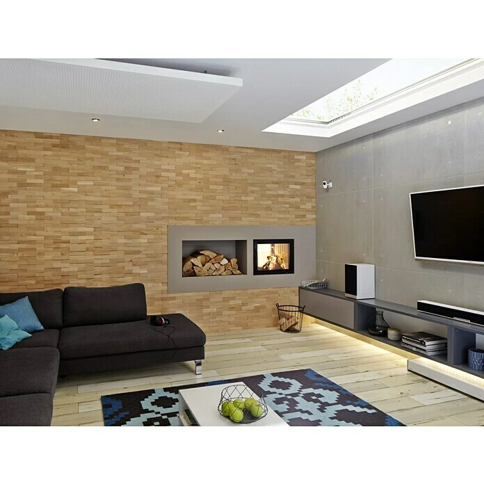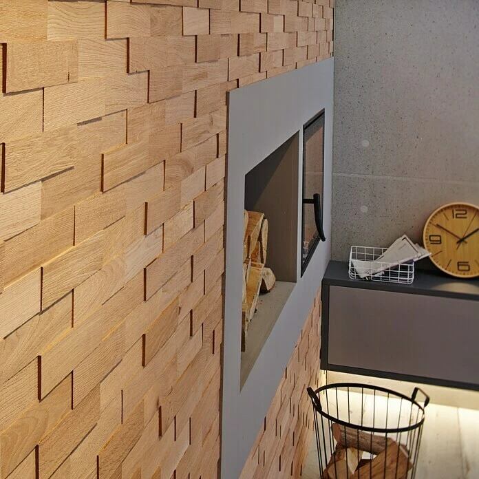 Die Wodewa Echtholzriemchen in Eiche gebürstet bieten jede Menge Möglichkeiten für die individuelle Innenraumgestaltung mit Holz. Mit der 3D-Holzdekoration gelingt es schnell und einfach Zimmerwände zu gestalten. Die Anwendung ist sowohl für große Flächen als auch kleine Akzente geeignet. Das Anbringen der Massivholzwandverkleidung ist auf allen tragfähigen, glatten und festen Untergründen möglich. Eine optimale Tiefenimprägnierung durch modernste Fertigungstechnik mit mehrmaligem Auftrag gewährleistet einen zuverlässigen Oberflächenschutz vor Feuchtigkeit und Verschmutzung. Die Wodewa Holzwandverkleidung kann mit einem weichen feuchten Tuch, einem Staubwedel oder durch Absaugen einfach gereinigt werden. Dank der drei verschiedenen Materialstärken entsteht eine außergewöhnliche 3D-Optik. Die freie Verlegung garantiert ein Unikat als Fläche. Natürliche Wuchsmerkmale und Farbabweichungen sind ein Beweis dafür, dass es sich um echtes Holz handelt.