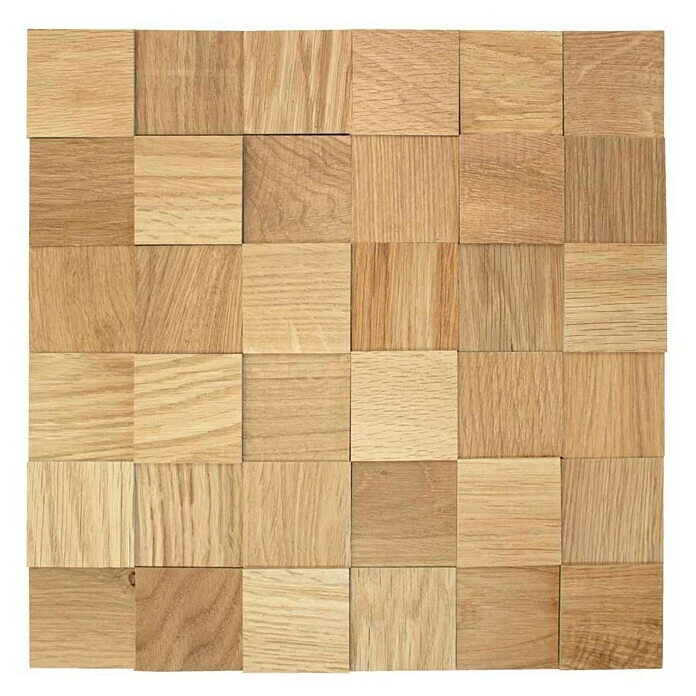 Das Wodewa Holzmosaik Eiche ist mit seiner natürlichen Farbvariation und charakteristischen Maserung die ideale Wahl für die Inneneinrichtung. Die Holzart passt sich den verschiedensten Interieur-Designs von Stadtwohnung bis Landhaus perfekt an. Jedes einzelne Holzmosaik wird auf eine selbstklebende Matte, sauber und sicher verklebt. Dabei werden 36 einzelnen Holzmosaike zu einer Matte verklebt. Ohne weitere zusätzliche Materialien wie Schrauben, Kleber oder Nägel erfolgt die Montage schnell und einfach. Jede einzelne Mosaikmatte ist durch die natürlichen Farb- und Strukturunterschiede und die aufwendige handverlese Verarbeitung der einzelnen Echtholzmosaik ein Unikat. Das einzigartige Design wird durch die einzelnen 3D Mosaike in 2, 4 und 6 mm Stärke geprägt.