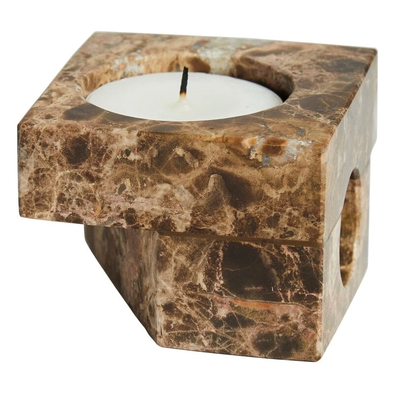 Der Kerzenständer wurde von Oleg Pugachev entworfen und besteht aus braunem Marmor. Das natürliche Material verleiht dem Ganzen eine reizvolle Individualität, da Muster und Farbe des Marmors von einem Kerzenhalter zum anderen variieren.